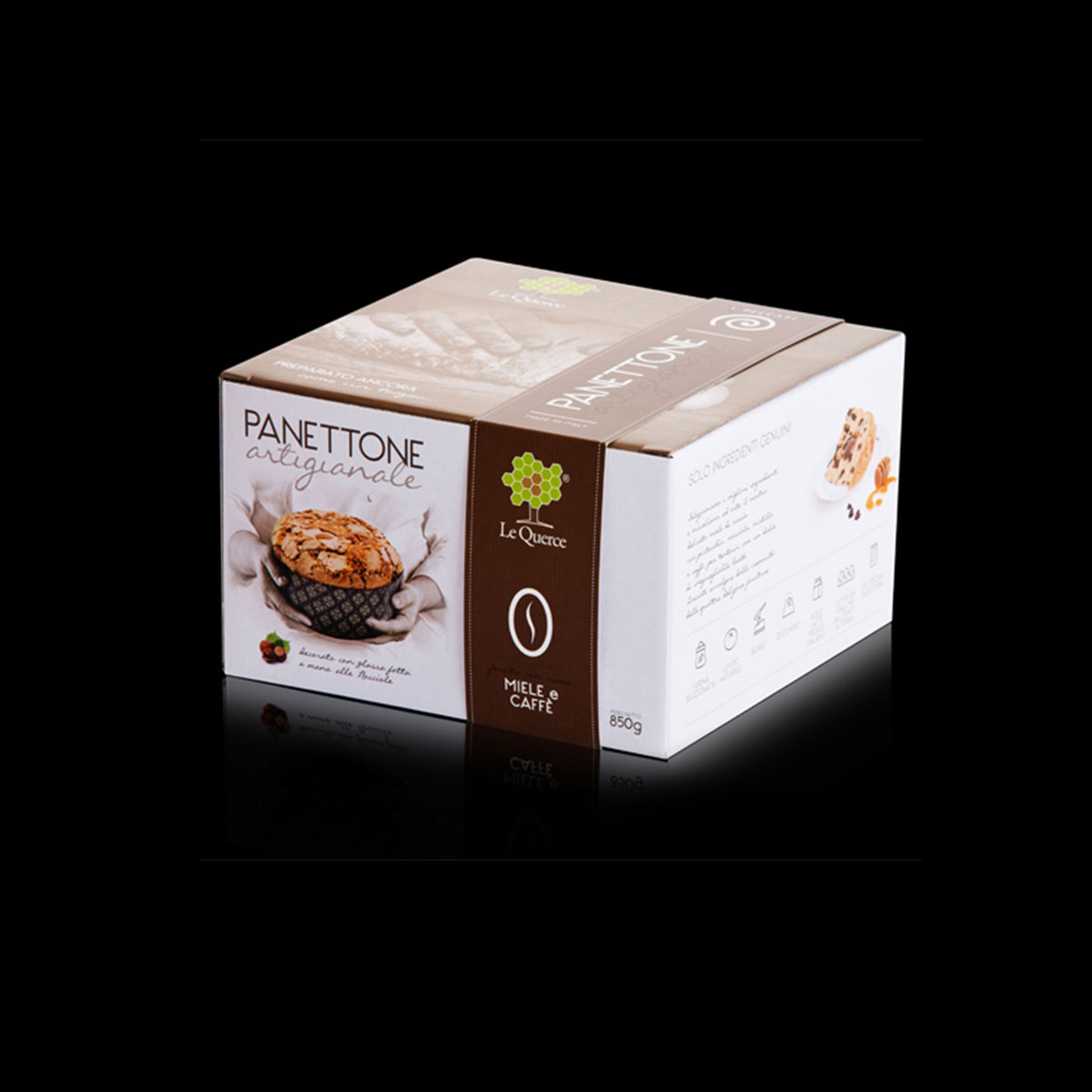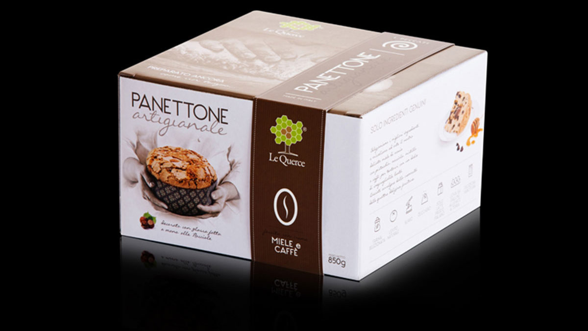 Il panettone artigianale Le Querce, fatto ancora a mano, è la prelibatezza della Linea I Peccati; un soffice dolce con gocce di cioccolato, impreziosito da una crema di miele e caffè, decorato con una croccante glassa di mandorle e nocciole Piemonte